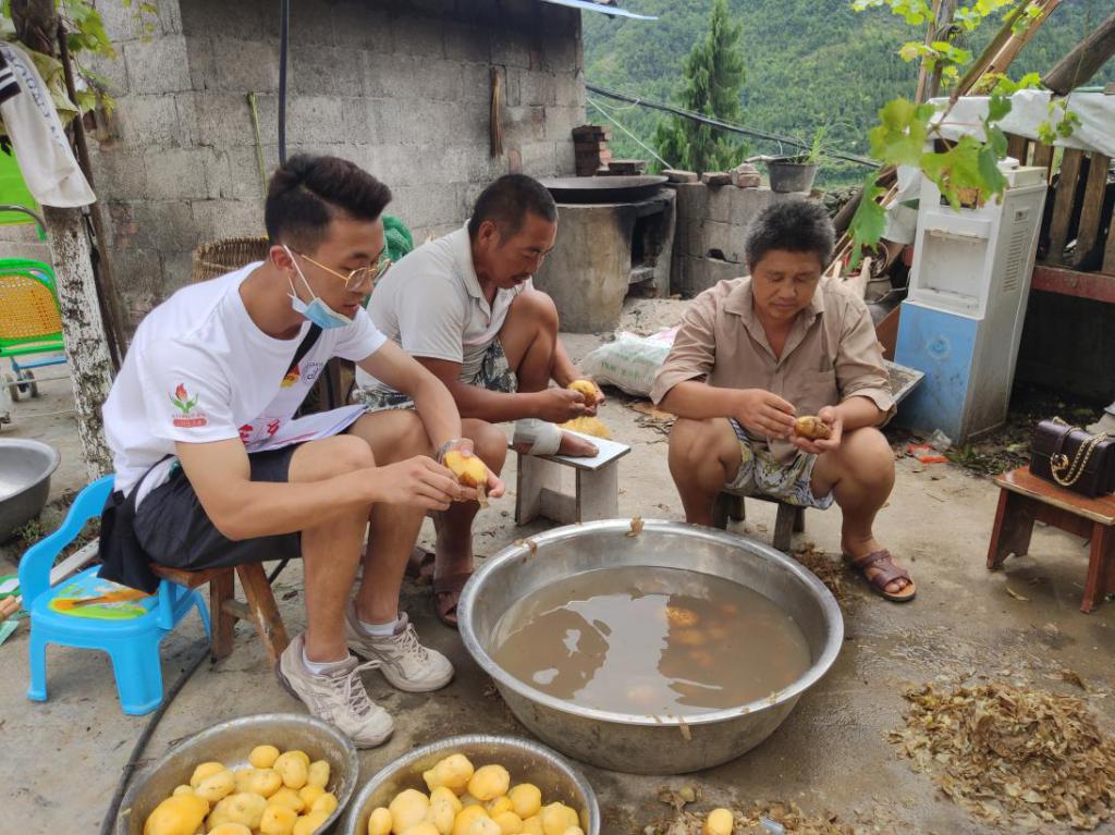 对于这一抹特殊的风景线,小组成员们迅速展开了多方面的了解和调研。在探访一位从事土豆种植加工的村民家中时,队员们了解“干洋芋块儿”的制作流程,亲自动手尝试操作了“干洋芋块”的生产制作流程。从清洗到蒸煮,再到剥皮、切片,然后进行摆放晾晒,经过几天的“日光浴”,就可以放到炕房进行最后的装袋。看似简单的流程,基础是优质的土豆品种和适宜的气候环境,除此之外还需要不断的尝试和摸索,才能将看似普通的土豆制作成色泽金黄、口感劲道的特色农产品。