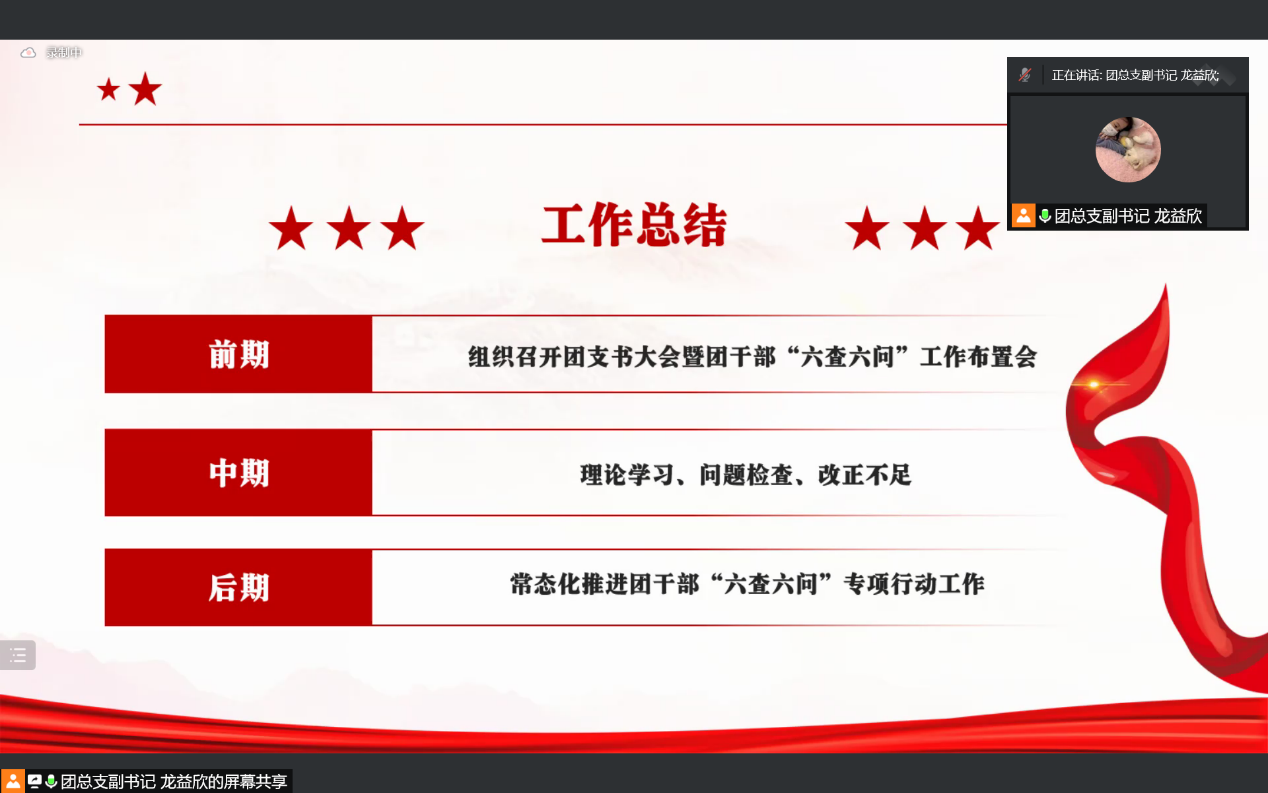 会议在团歌声中拉开帷幕。首先由团总支副书记龙益欣从三个时期总结上一学期团总支工作开展中的不足以及经验。公司团总支前期开展了一系列“六查六问”专项活动—专题读书班、批评与自我批评大会、工作满意度调查等,多形式多角度检查工作。也从中发现了许多大大小小的问题,如:团干部缺乏积极性、懒散等。中期重点解决这些问题以及总结经验,后期则要充分利用好实践经验以便常态化推进团干部“六查六问”专项行动工作。